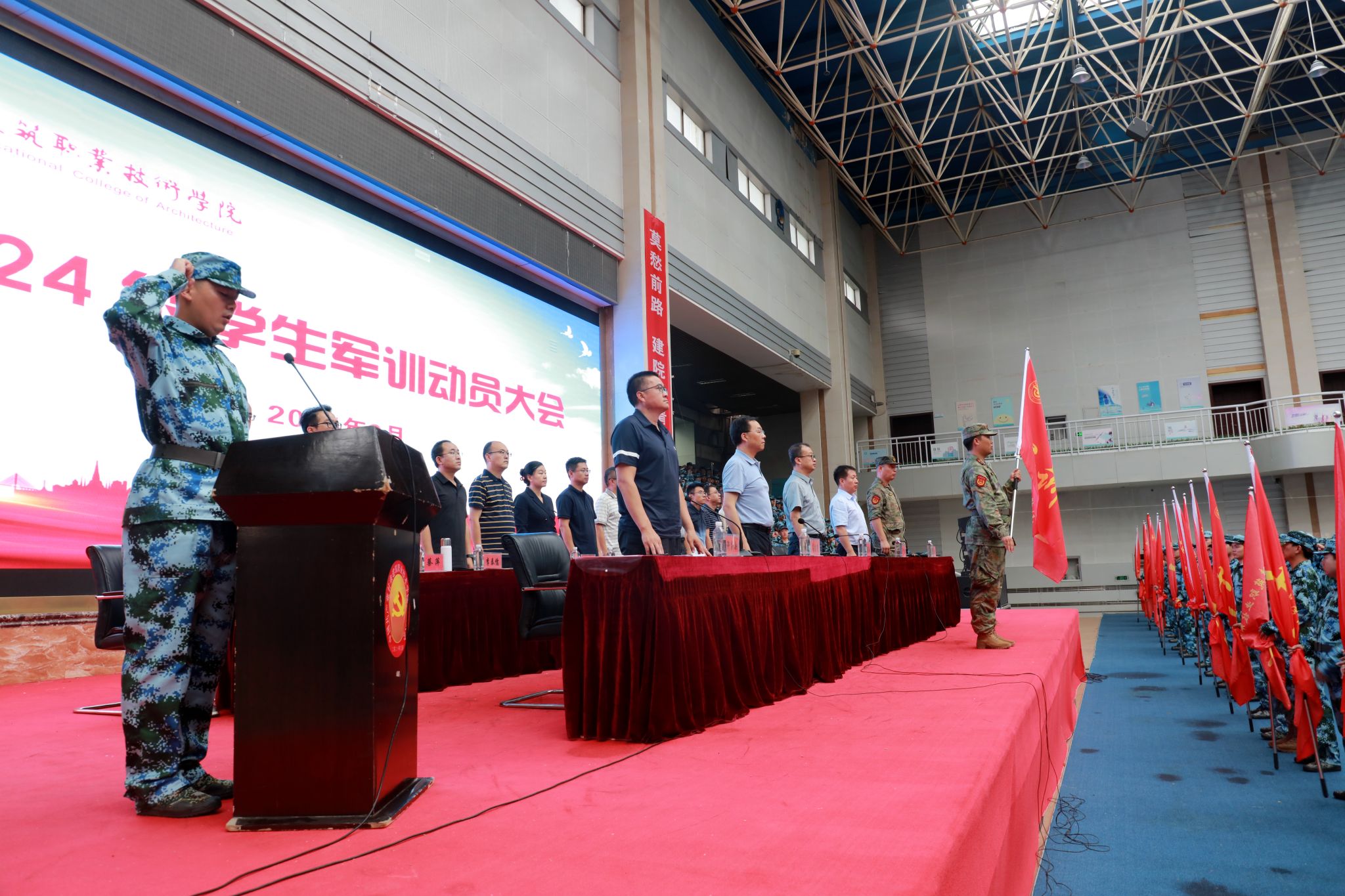9月1日,甘肃建筑职业技术学院2024级学生军训动员大会暨开训仪式成功举行,军训工作领导小组组长、学校党委副书记、校长党星海,军训工作领导小组副组长、党委委员、副校长高忠有,学校党委委员、纪委书记、监察专员杜彦斌,二级学院、相关部门负责人以及军训团工作人员参加仪式。